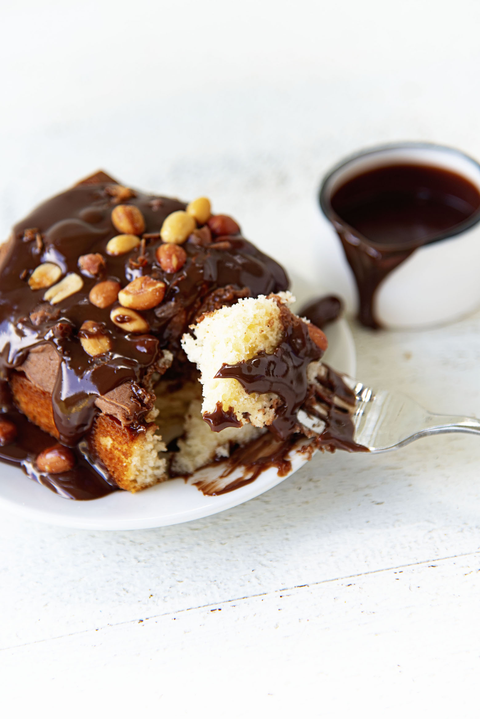 - Drizzle half the hot fudge sauce over the cake and top with Spanish peanuts.