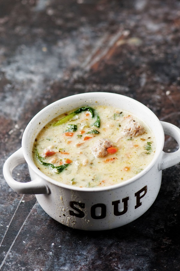 Everyone has their own version of Italian Wedding Soup…mine has hearty meatballs, chicken stock, spinach, egg, and cheese.